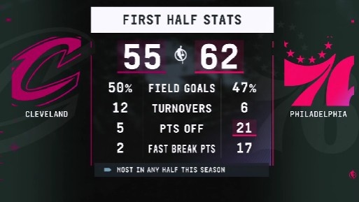 反击打到爽!76人上半场利用骑士失误得分21分 联盟本赛季最高